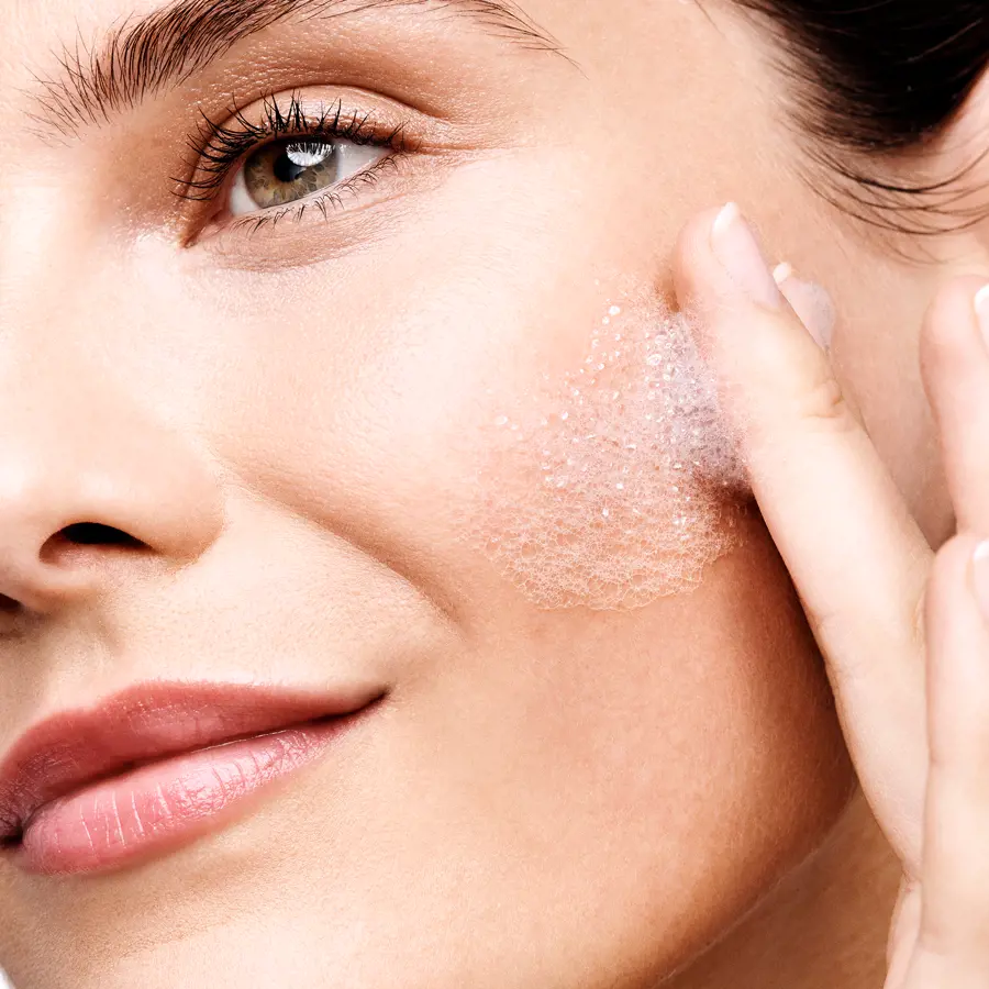 1) Очищающее средство каждый день. Втирай небольшое количество средства кончиками пальцев в увлажненную кожу лица. Оставь на минуту и смой теплой водой. Вытри лицо насухо;