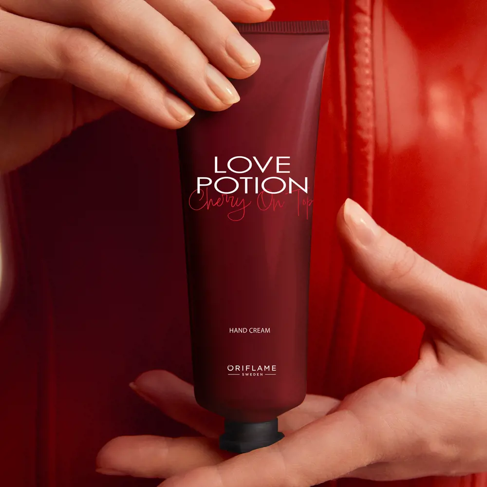 Аромат любит многослойность! Сначала нанеси парфюмированный крем для рук Love Potion Cherry on Top на точки пульса – увлажнённая кожа поможет аромату держаться дольше, ведь молекулам будет за что зацепиться.