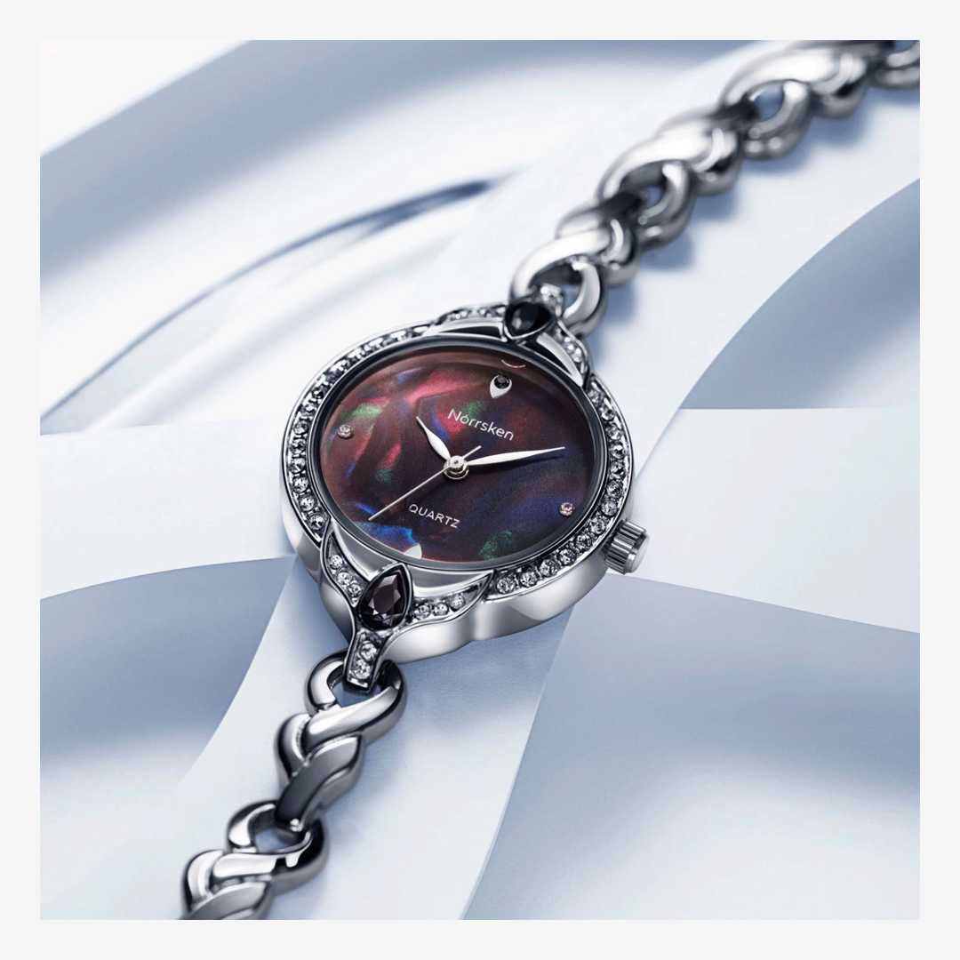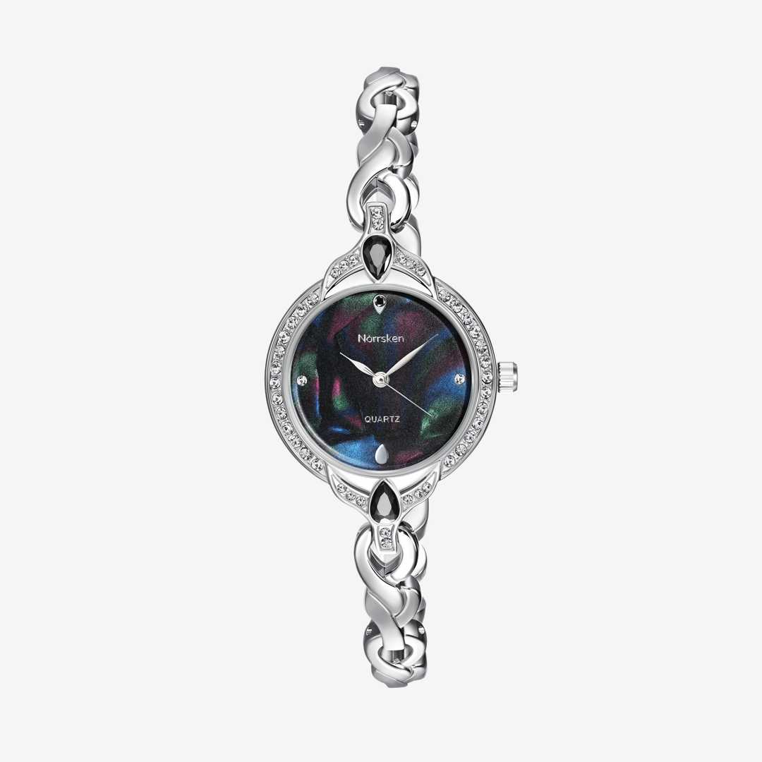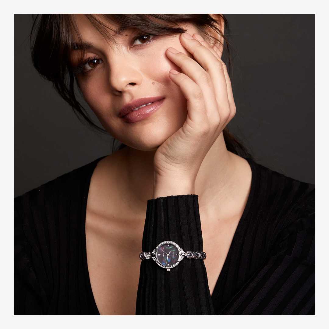 Шикарный аксессуар к вечернему платью и компаньон к повседневным украшениям. Серебристый браслет, имитирующий плетение, и инкрустация из чёрных и прозрачных кристаллов оттеняют циферблат с переливающимся тёмно-радужным покрытием.
