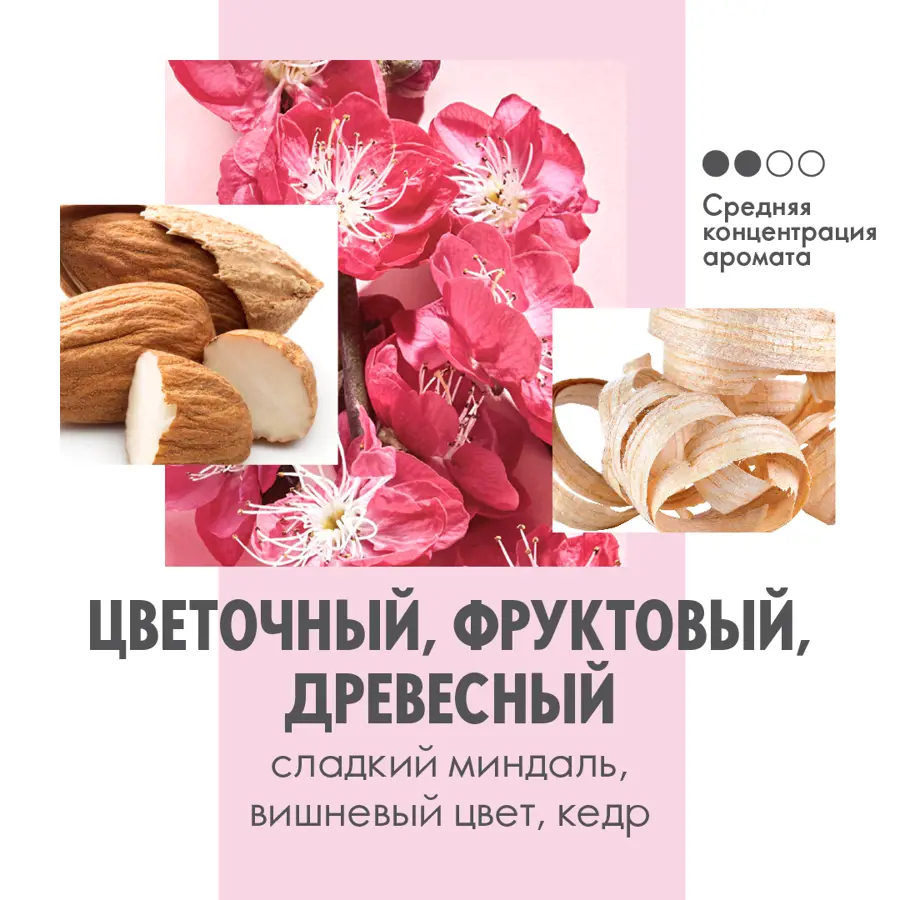 Перенеситесь в цветущий сад! Начальные нотки сладкого миндаля плавно раскрываются сердцем из тонких вишневых лепестков, завершаясь умиротворяющим шлейфом из великолепного кедра.