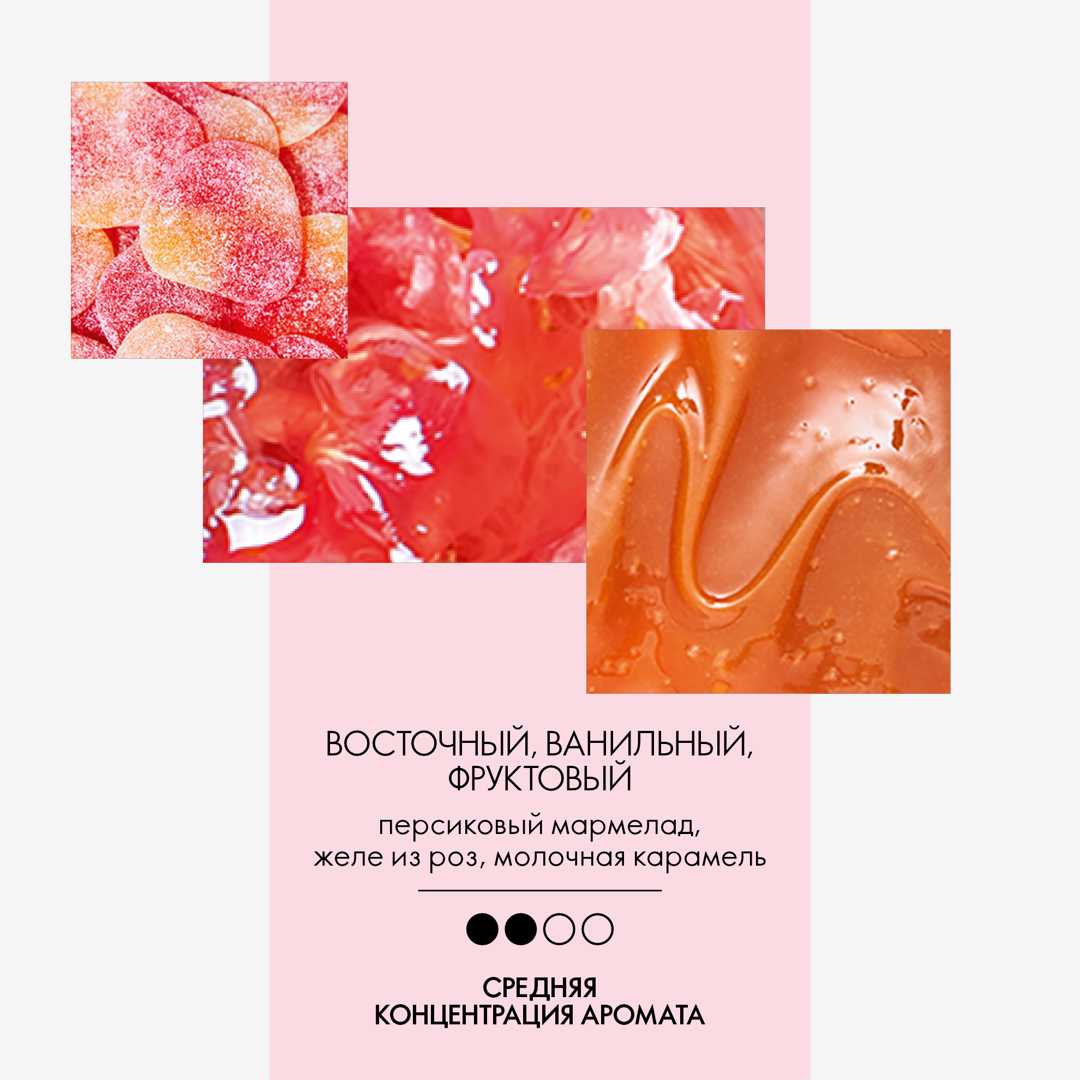 Яркий фруктово-ягодный взрыв персикового мармелада и розового желе плюс гурманский шлейф из молочной карамели и сандала в ностальгическом аромате, который воскрешает в памяти беззаботные сладкие дни.